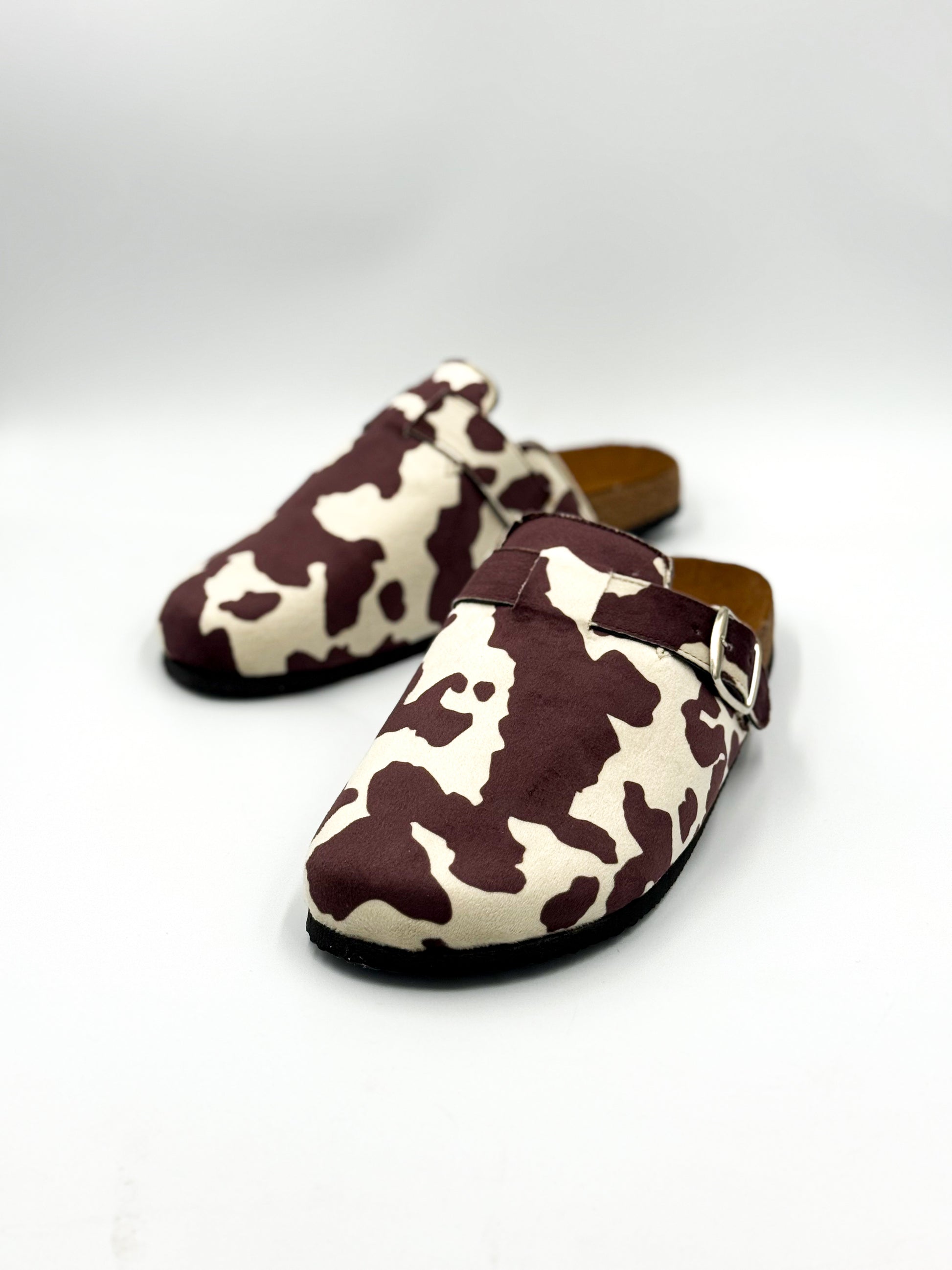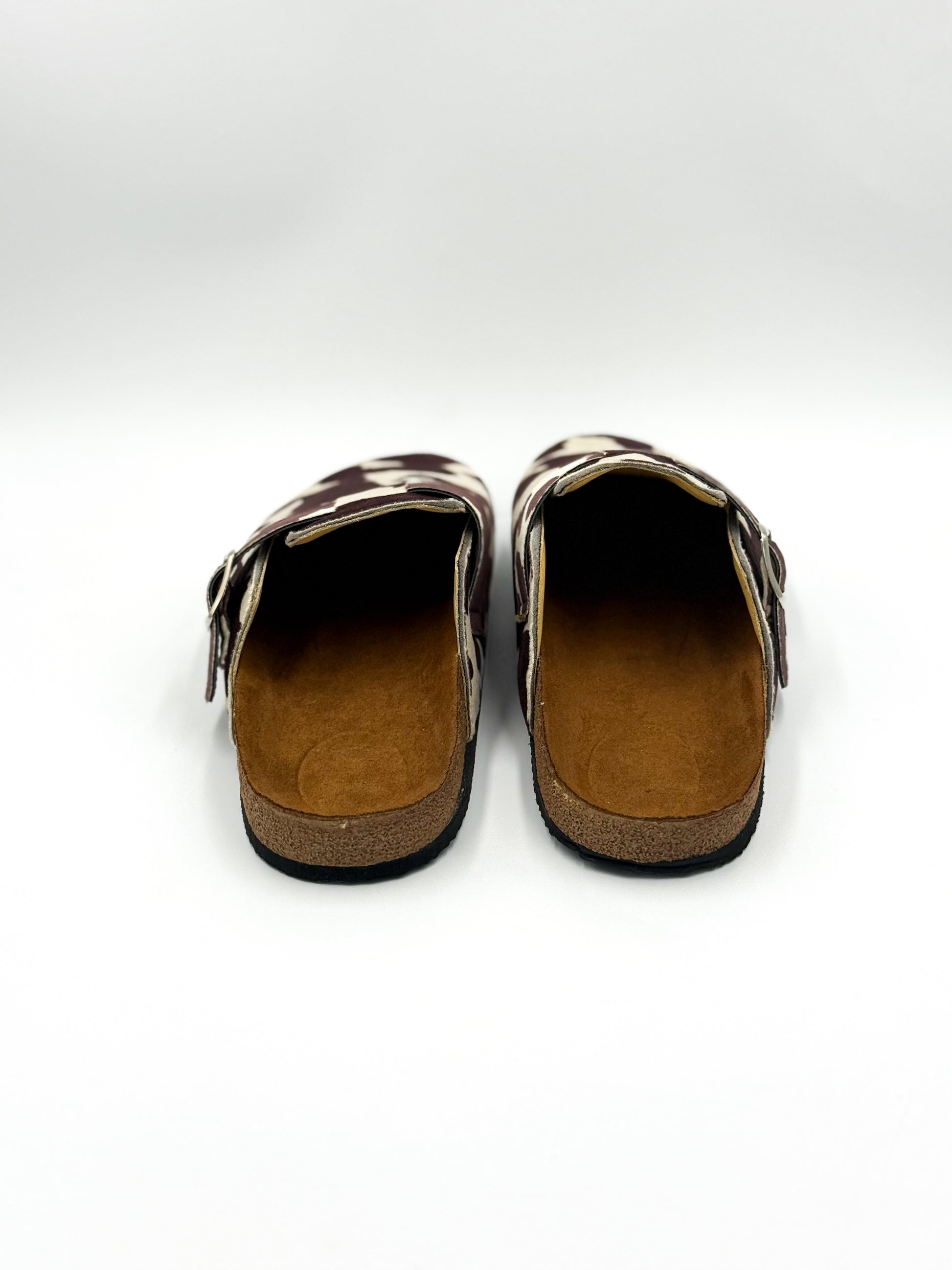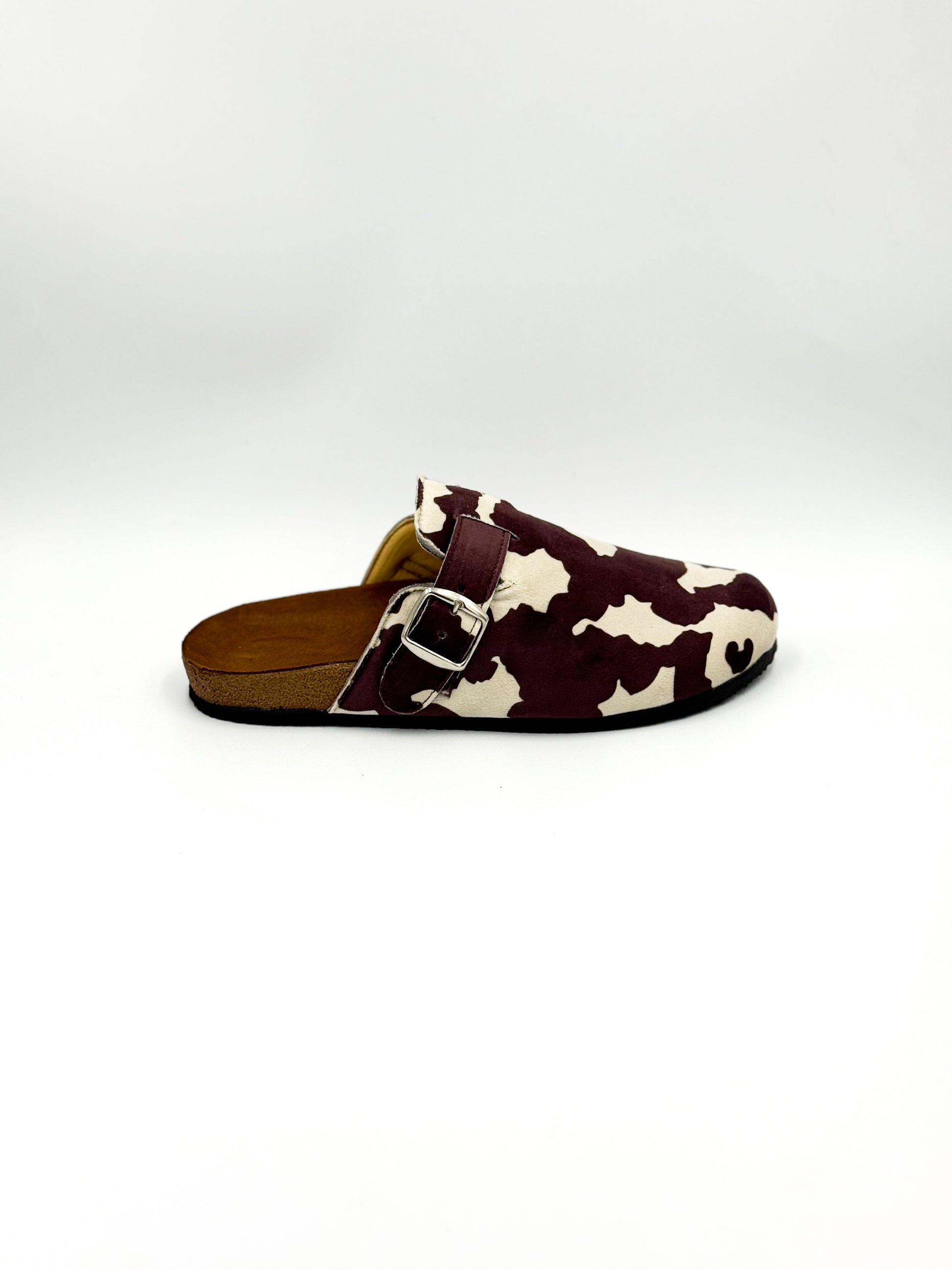 Hechas a mano en México, nuestras Vaquita Wine reinventan el clásico clog con una textura tipo gamuza, suela cómoda y print de vaquita en tonos vino y crema.