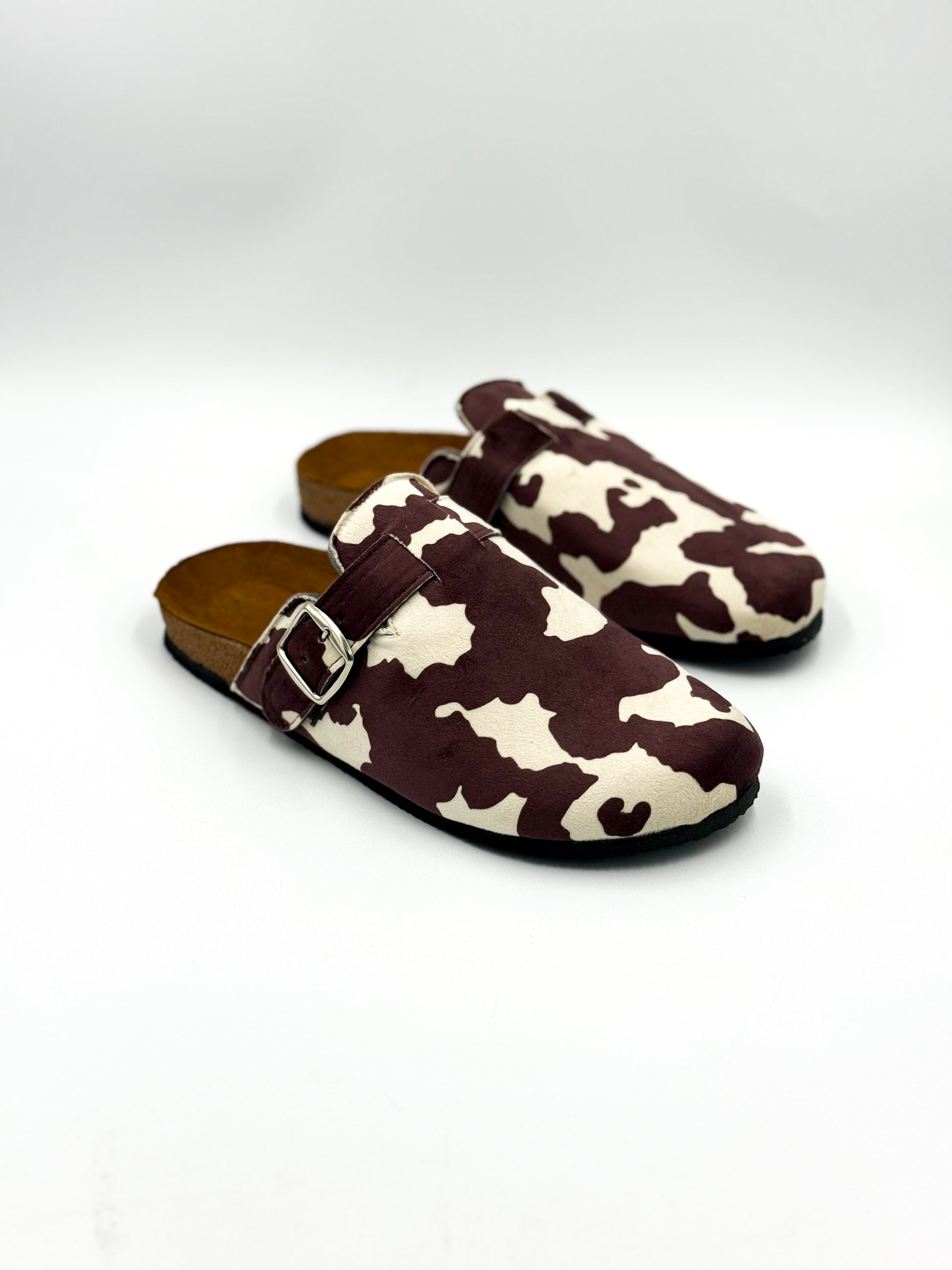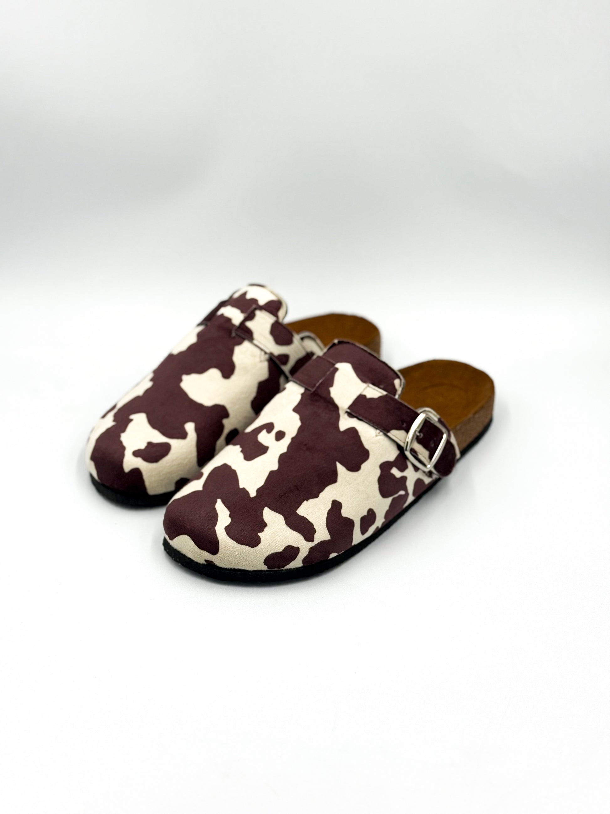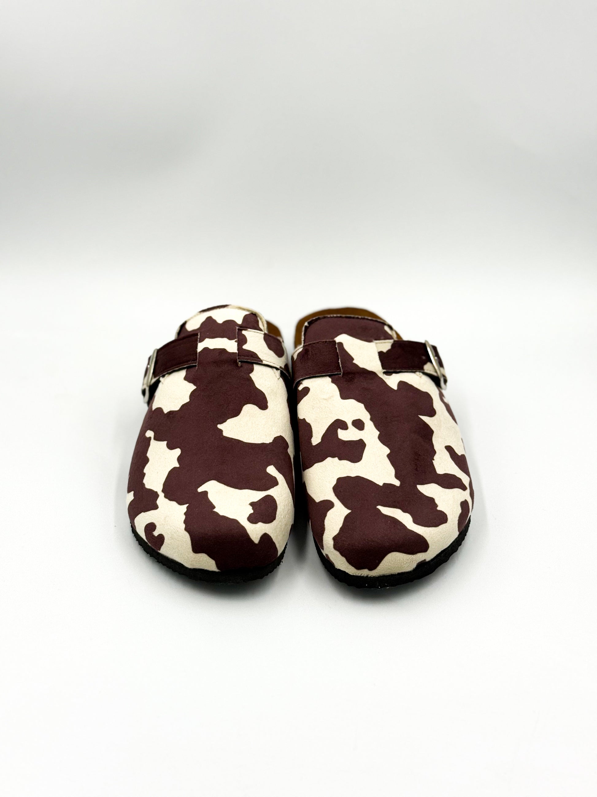 Hechas a mano en México, nuestras Vaquita Wine reinventan el clásico clog con una textura tipo gamuza, suela cómoda y print de vaquita en tonos vino y crema.